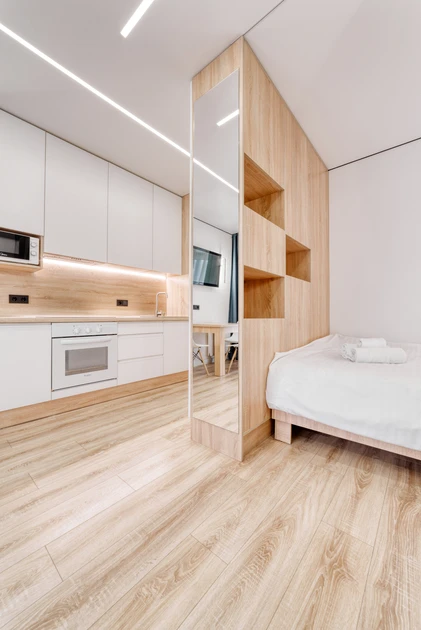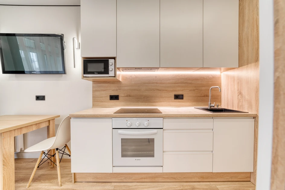 Cozy studio apartment available for short-term rental in the Minsk-World complex at 15 Bratskaya Str. It is located on the 3rd floor of a 25-story building equipped with an elevator.